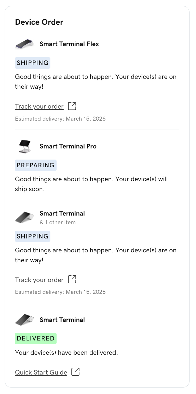 Improvements to hardware order tracking, accessories management, and device setup across Commerce Home. Merchants see newly placed orders sooner with clearer shipping and delivery states, can onboard POS devices and accessories more easily, and get better support guidance through a refreshed Troubleshoot/Get Help experience.