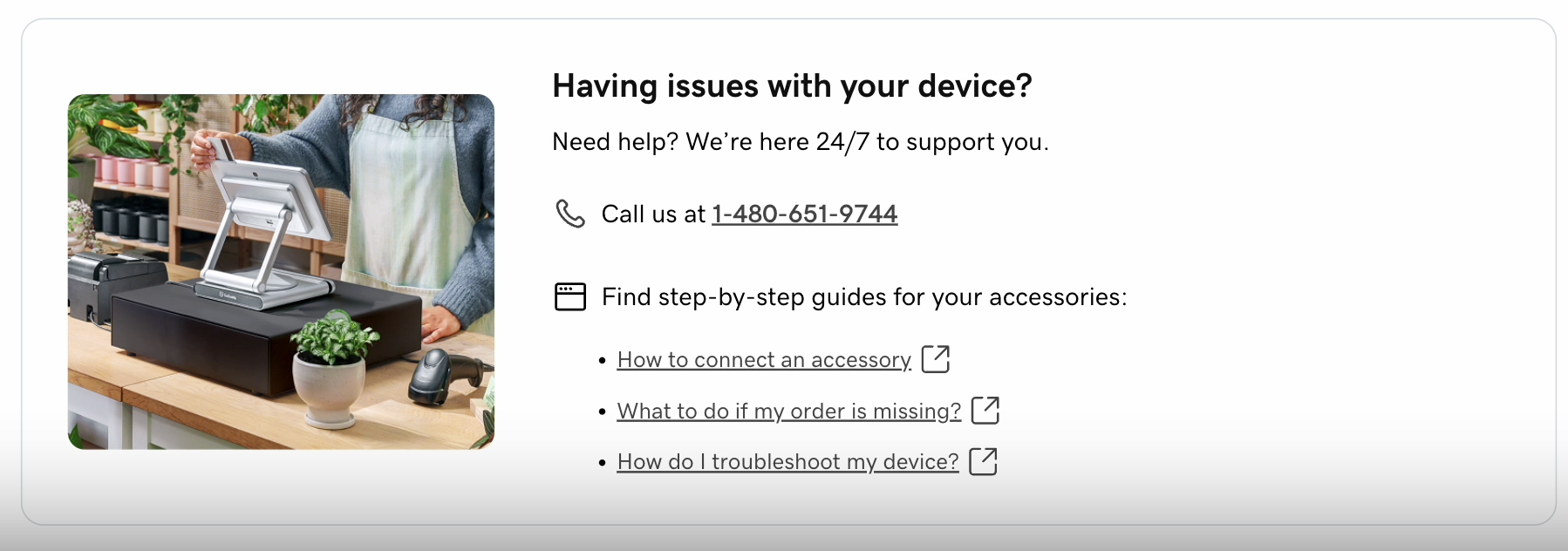- 3Devices right rail and support — device and accessory cards prioritize POS devices first, and the Get Help card provides clearer localized support guidance